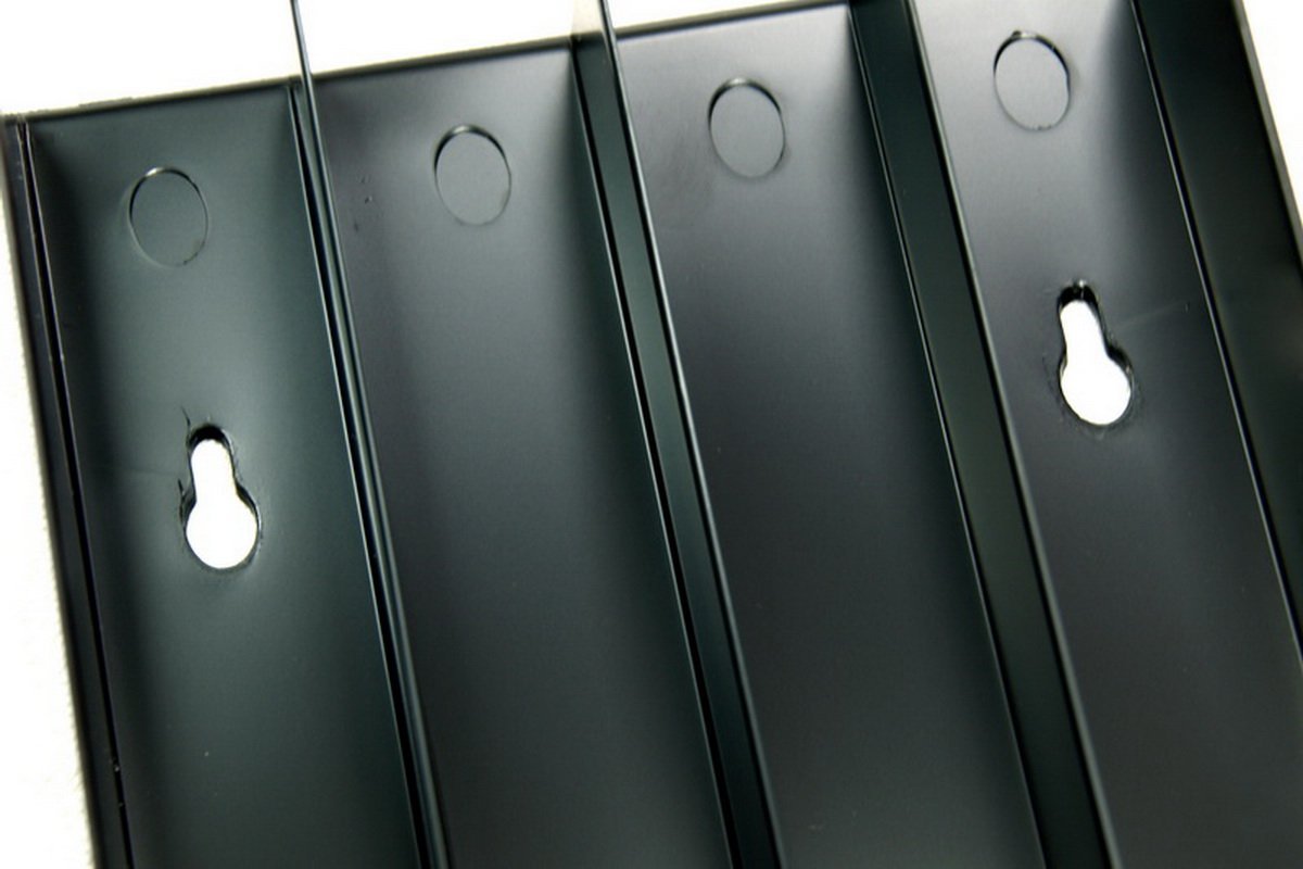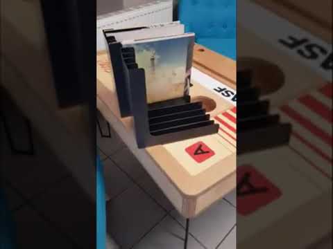 Packung mit 2 Eckbehältern mit Fächern für eine Gesamtkapazität von 80 12-Zoll-LP-Schallplatten mit 33 U/min. Sie müssen auf einer Oberfläche platziert werden und können in Reihe geschaltet werden. Maße je Behälter: 317 x 317 x 160 mm.