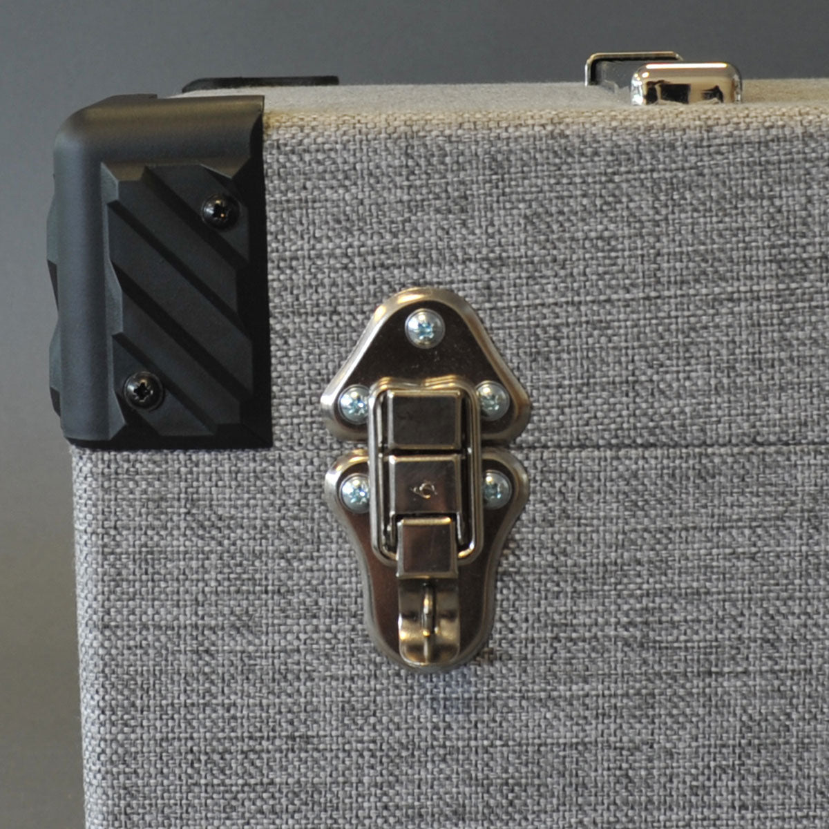 Mit grauem Stoff überzogener Holzkoffer für 100 Schallplatten mit 10 Zoll und 78 U/min