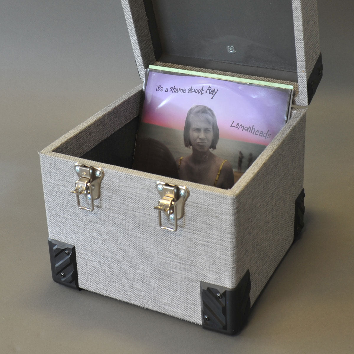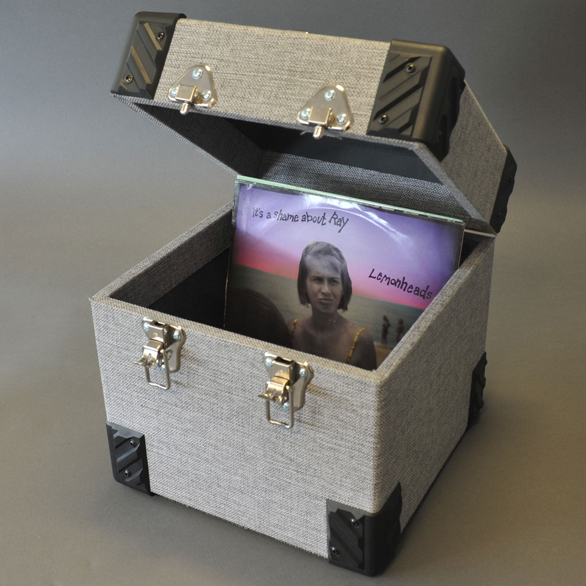 Holzkoffer mit grauem, waschbarem Stoff bezogen, enthält etwa 100 10-Zoll-Schallplatten mit 78 U/min. Handgefertigte Kreation im Retro-Stil, Gummiverstärkungen in den 4 Ecken, abnehmbarer, verschließbarer Deckel. Außenmaße: 32,5 cm breit x 32,5 cm hoch x 31 cm tief. Innenbreite 27,7 cm x 27,7 cm hoch x 28 cm tief.