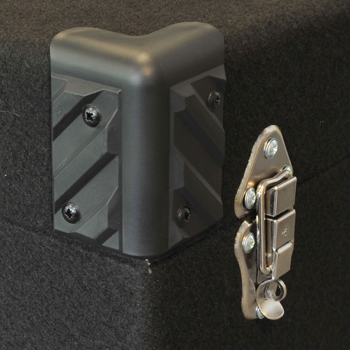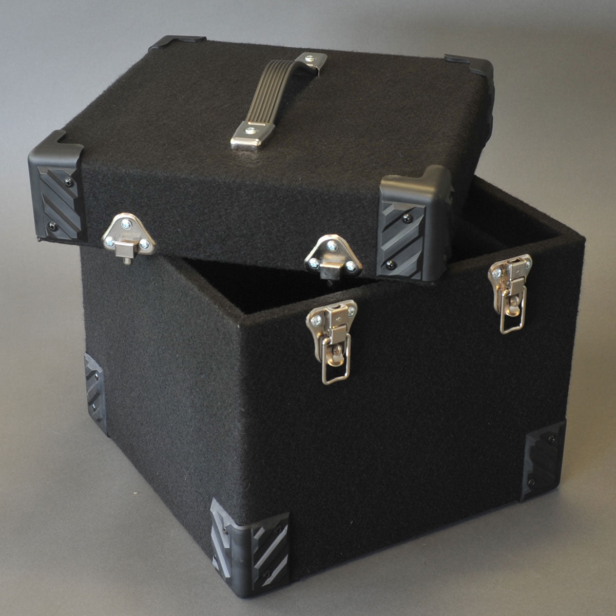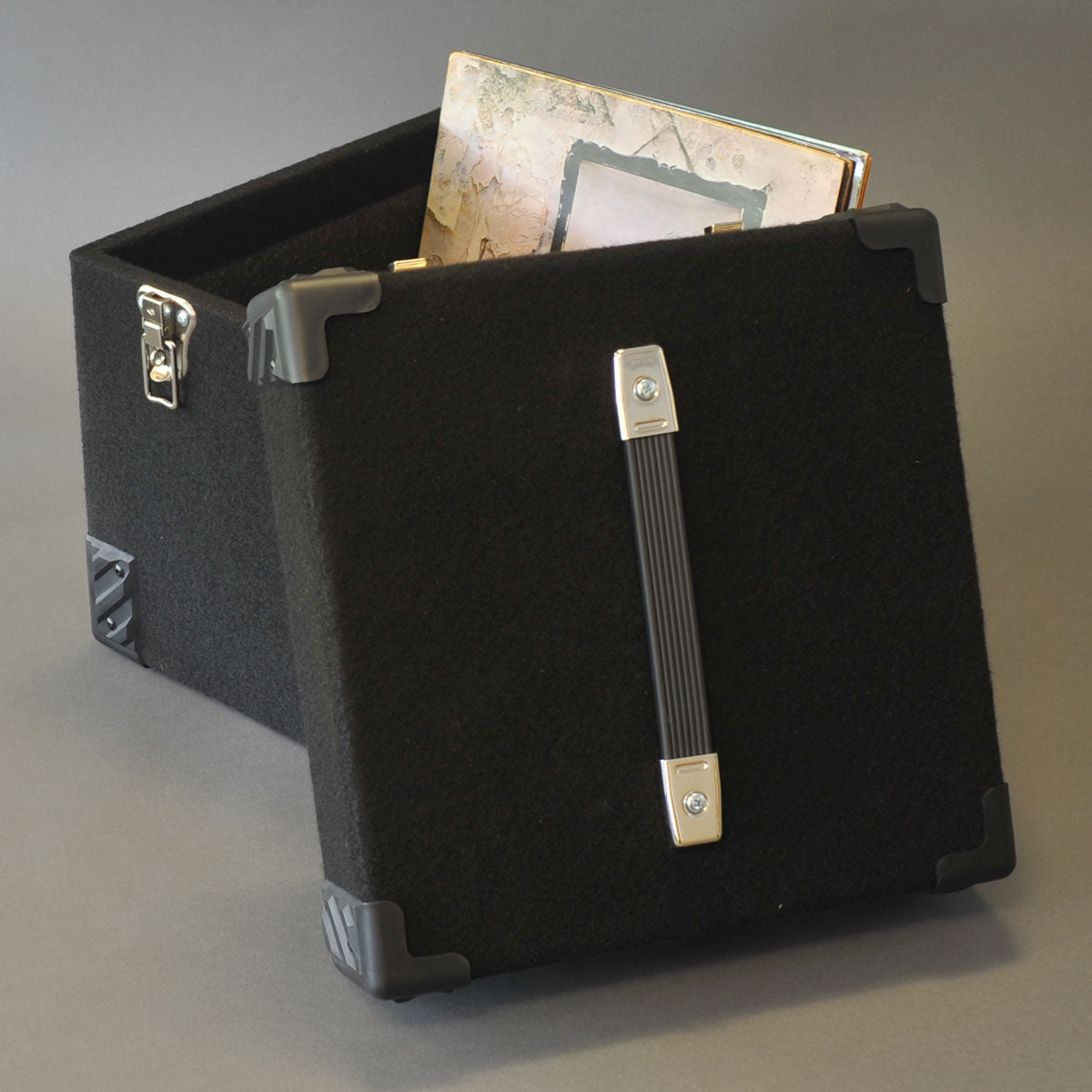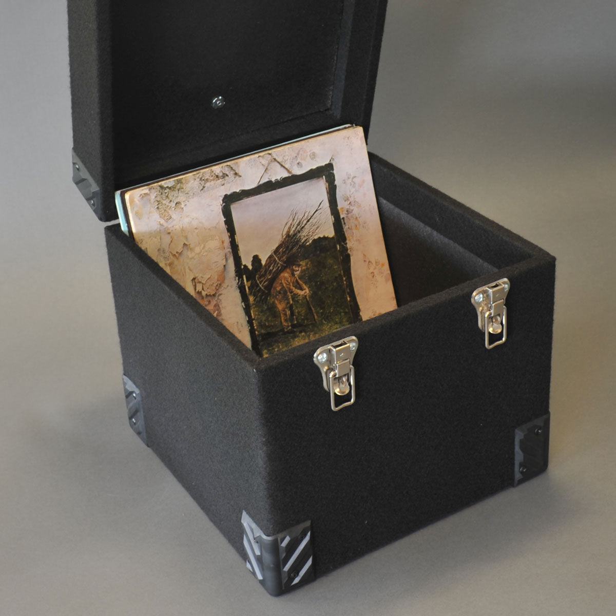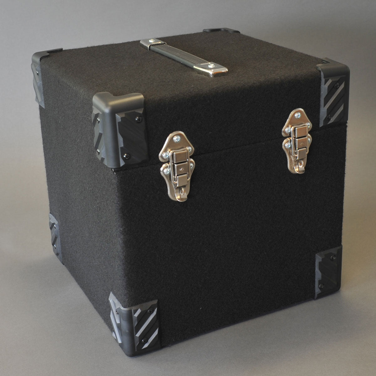 Baúl de madera revestido con tela negra lavable, caben unos 100 discos de 12 pulgadas 33 rpm. Creación artesanal en estilo retro, refuerzos de goma en las 4 esquinas, tapa desmontable, con cerradura. Dimensión externa: 37,5 cm de ancho x 37,5 cm de alto x 36 cm de profundidad. Ancho interno 33cm x 33cm alto x 33cm fondo.
