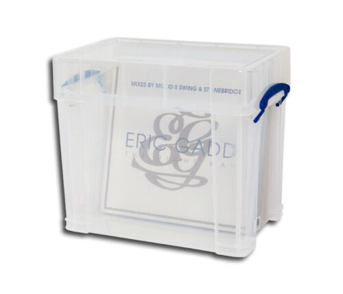 Recipiente de plástico transparente, muy resistente, con tapa y mangas, cierre entrelazado, protege del polvo y la humedad, tiene capacidad para 50 vinilos 12 pulgadas lp 33 rpm, ideal para almacenamiento y transporte, también apto como expositor en ferias récord. Medida exterior: 395 x 255 x 330 mm. Medidas internas: 315 x 205 x 310 mm.