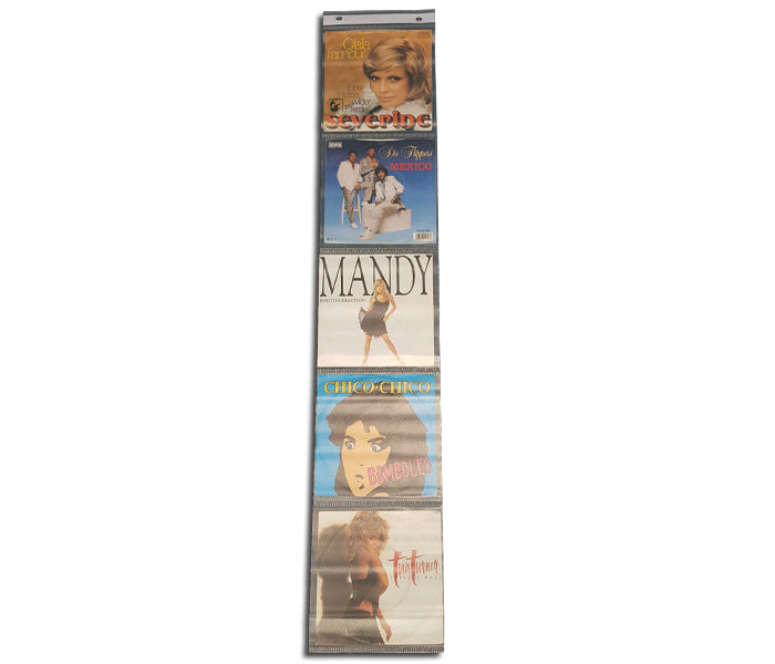 présentoir transparent pour 5 vinyles 7 pouces, 45 tours, (avec couvercle), à accrocher au mur ou au plafond en plastique pvc transparent, avec finition satinée anti-reflet, il peut être disposé en série dans la quantité que vous voulez, dans le chambre, magasin ou salle d'exposition. Taille 190x1000mm.
